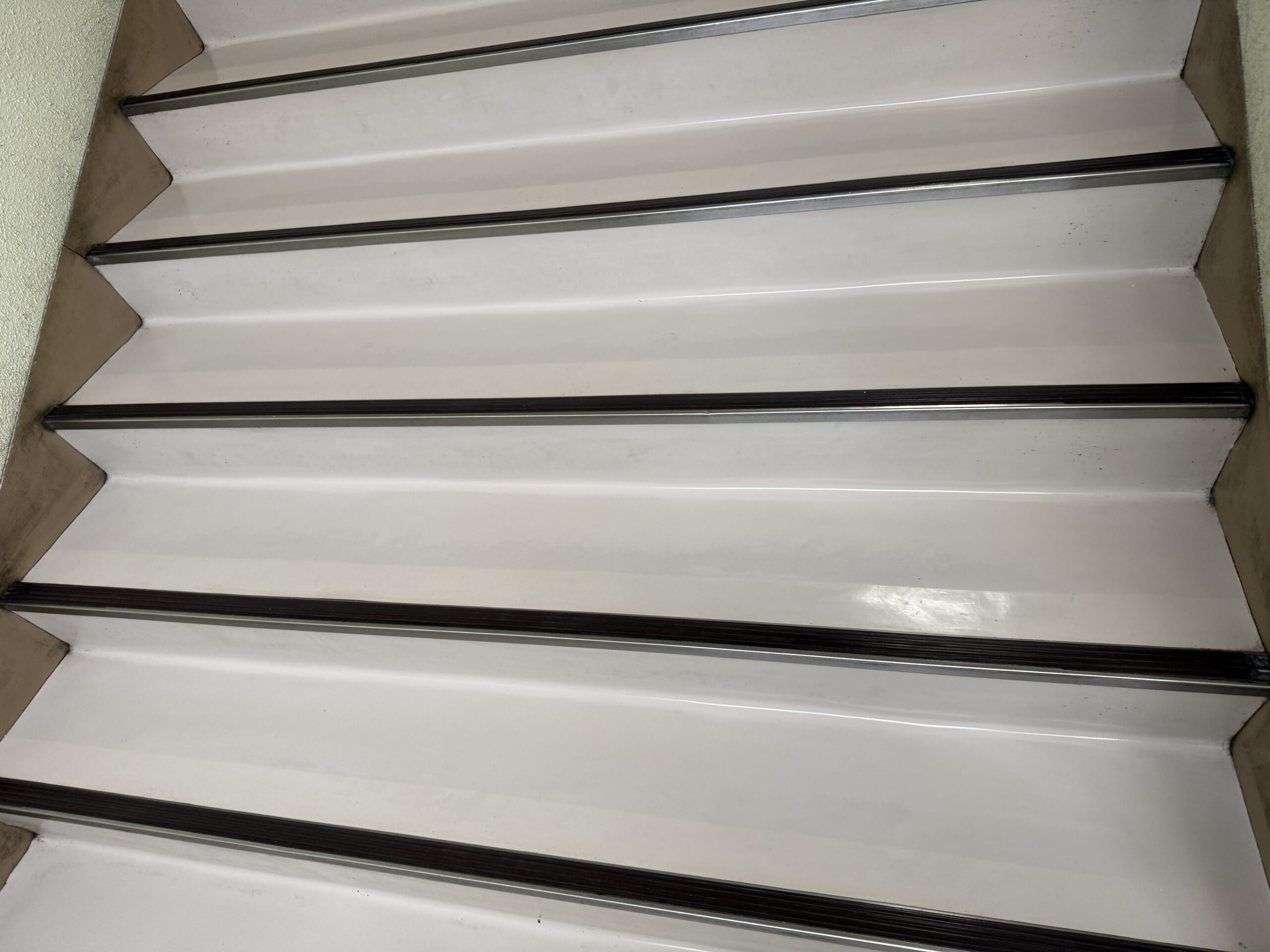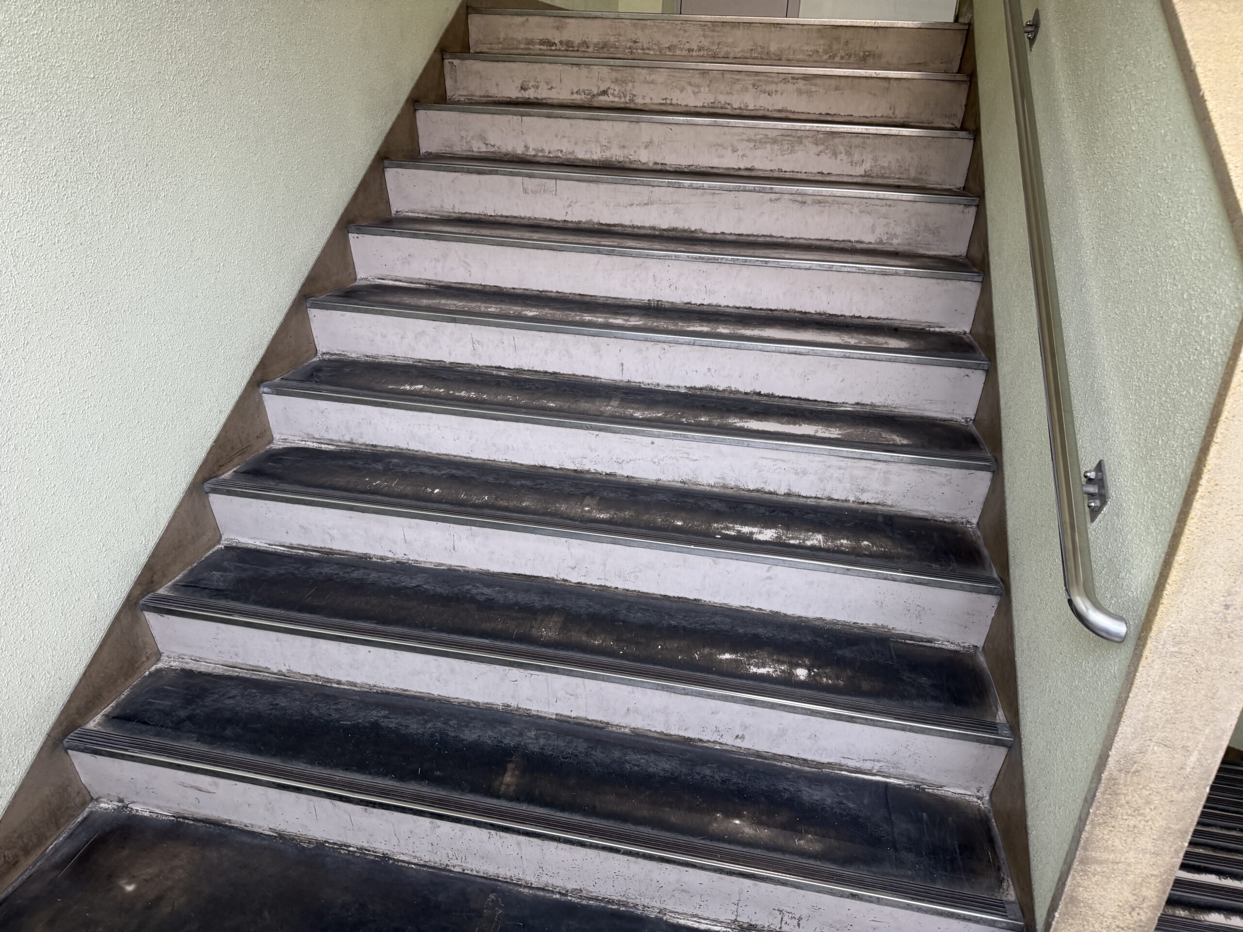 本日、都内中小学校にて、児童が毎日利用する階段共用部の定期清掃を実施いたしました。 作業前は踏面に黒ずみや汚れが蓄積しており、衛生面および安全性の観点から清掃が必要な状態でした。