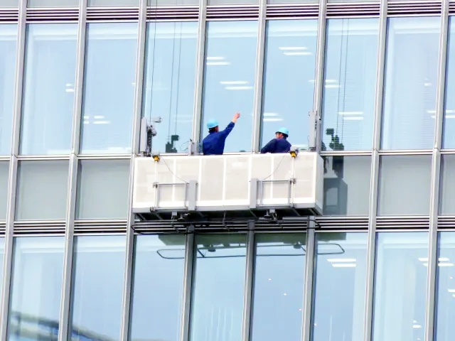 高所作業の有資格者が、複雑なビルから高層ビルまで、ゴンドラやブランコなどを使用し、拭き残しのない仕上がりで清掃いたします。
